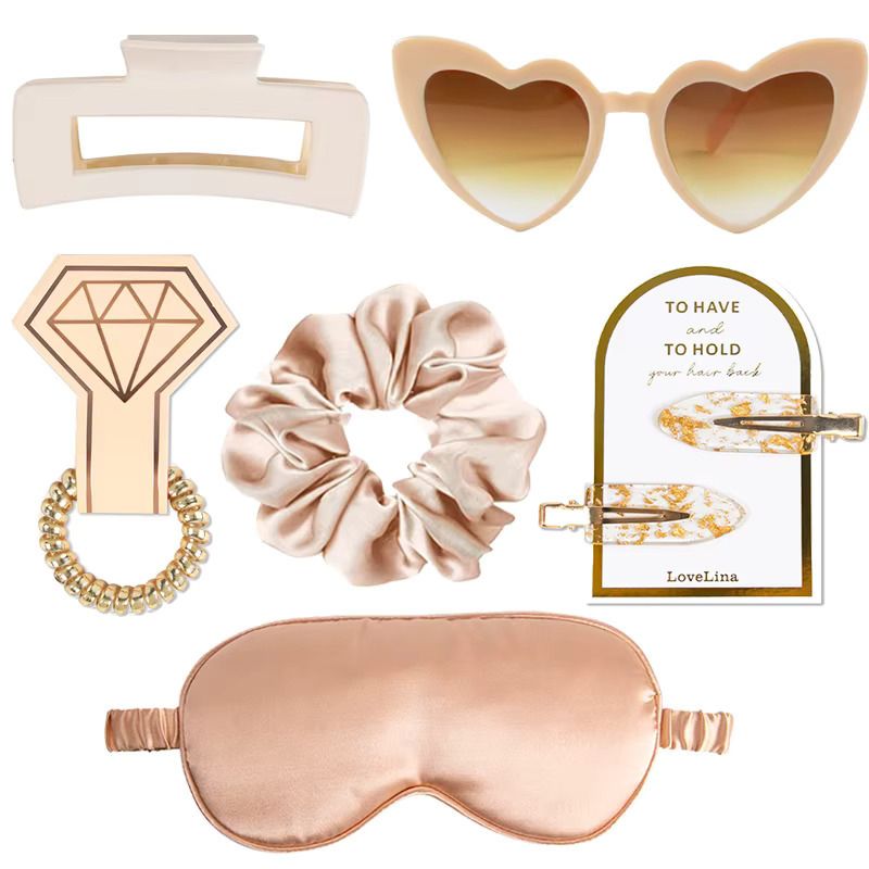 Obsah sady: sluneční brýle, kolíček do vlasů, scrunchie gumička, spirálová gumička, 2 ks sponek, maska na spaní.