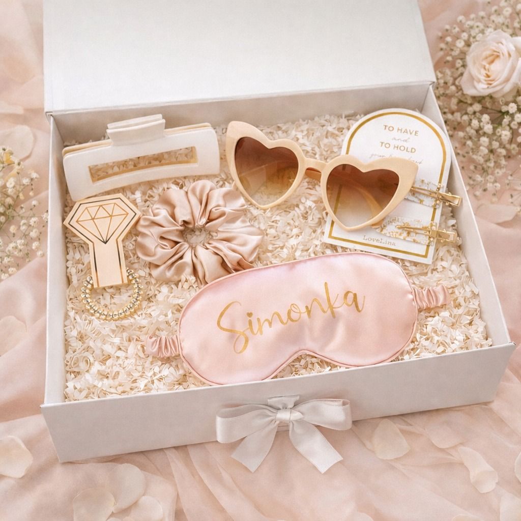 Dárková sada pro nevěstu nebo pro družičky zabalená v dárkové krabičce se jménem.