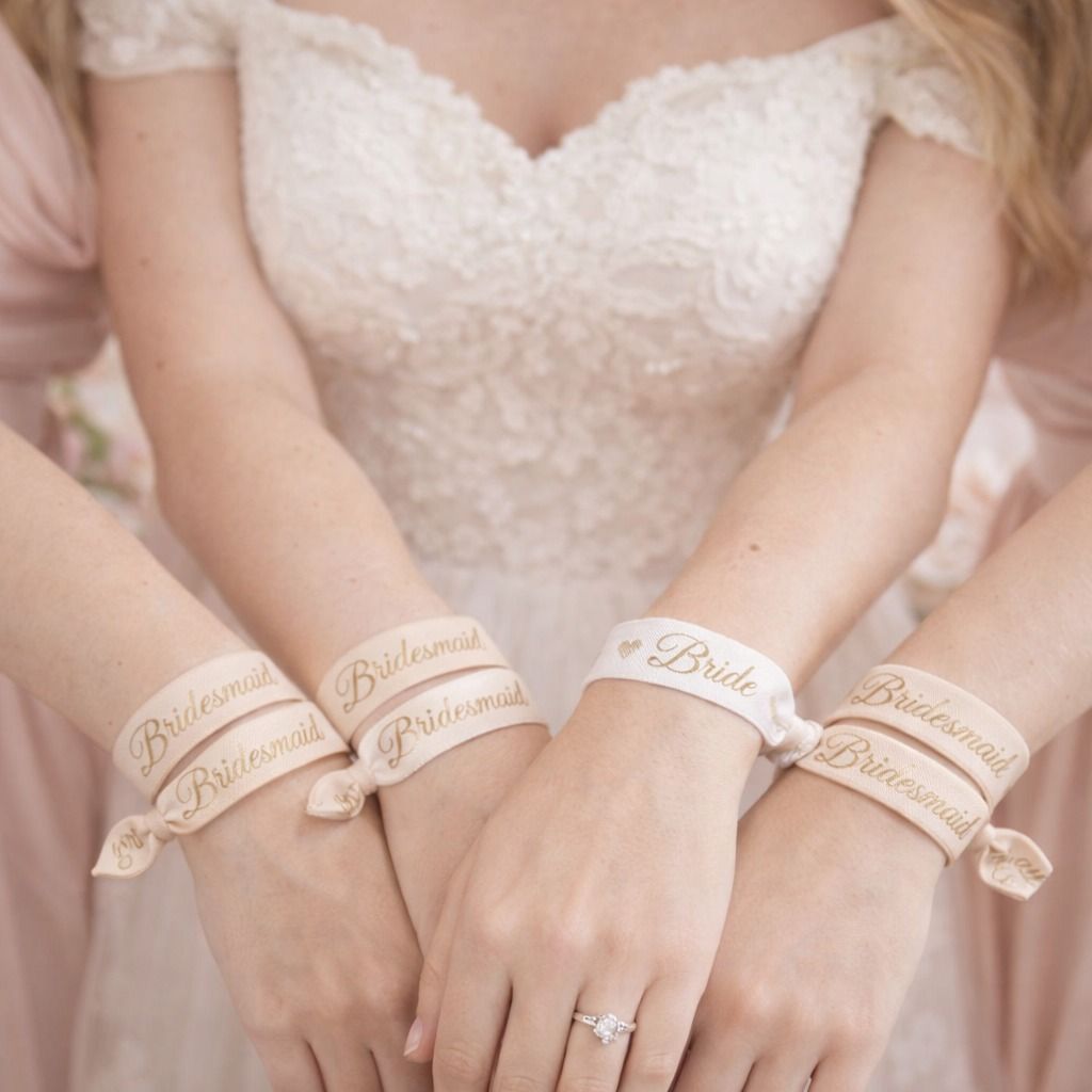 Sada náramků na rozloučenou se svobodou. V balení je 7 náramků - 1 bílý pro nevěstu (nápis Bride) a 6 zlatých pro družičky (nápis Bridesmaid).