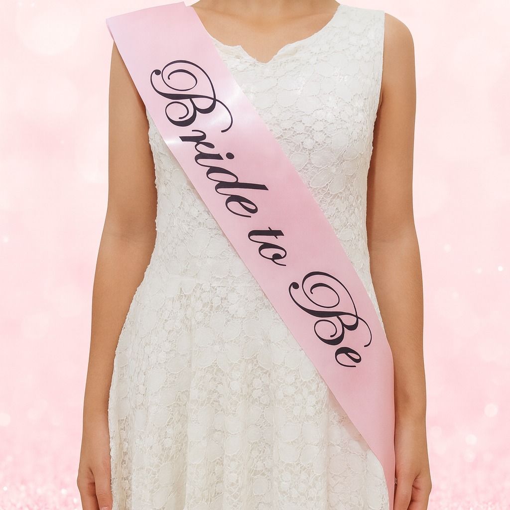 Růžová saténová šerpa pro nevěstu s černým nápisem.