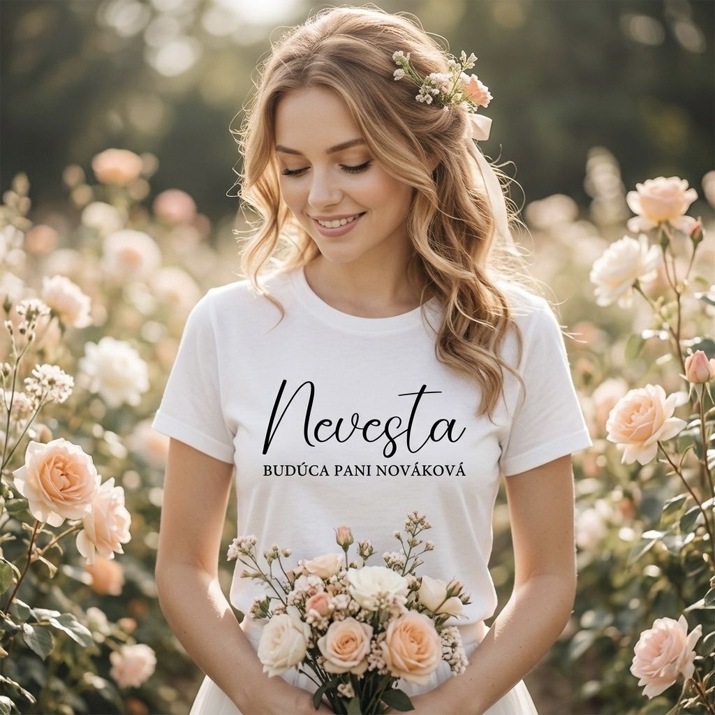 Bílé triko pro nevěstu s vlastním textem. Triko si můžete přizpůsobit libovolným textům a bude tak perfektním dárkem pro nevěstu nebo na rozloučenou se svobodu. K tričku pro nevěstu si můžete sladit také trička pro družičky, svědkyni nebo svatební mámu.