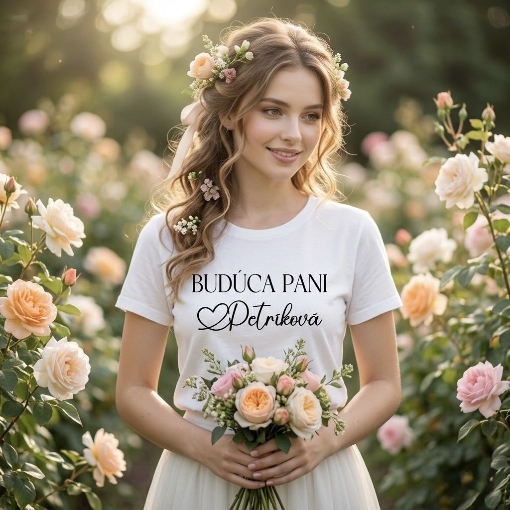 Bílé triko pro nevěstu s vlastním textem. Triko si můžete přizpůsobit libovolným textům a bude tak perfektním dárkem pro nevěstu nebo na rozloučenou se svobodu. K tričku pro nevěstu si můžete sladit také trička pro družičky, svědkyni nebo svatební mámu.