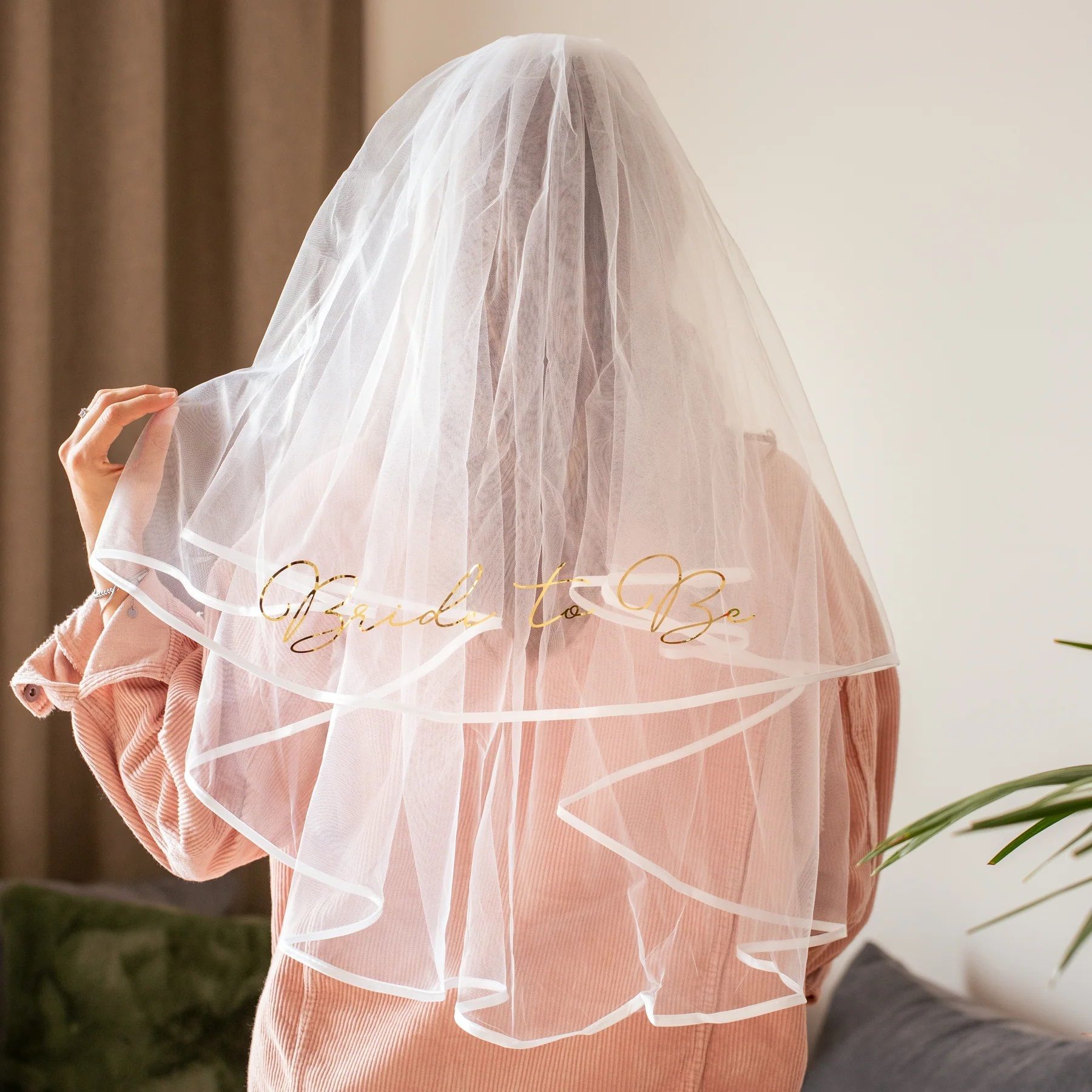 Závoj na rozlučku se svobodou s nápisem Bride to be v růžově zlaté barvě. Závoj je ukončen hřebínkem.