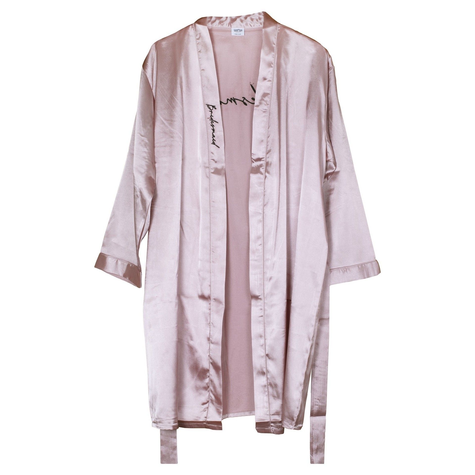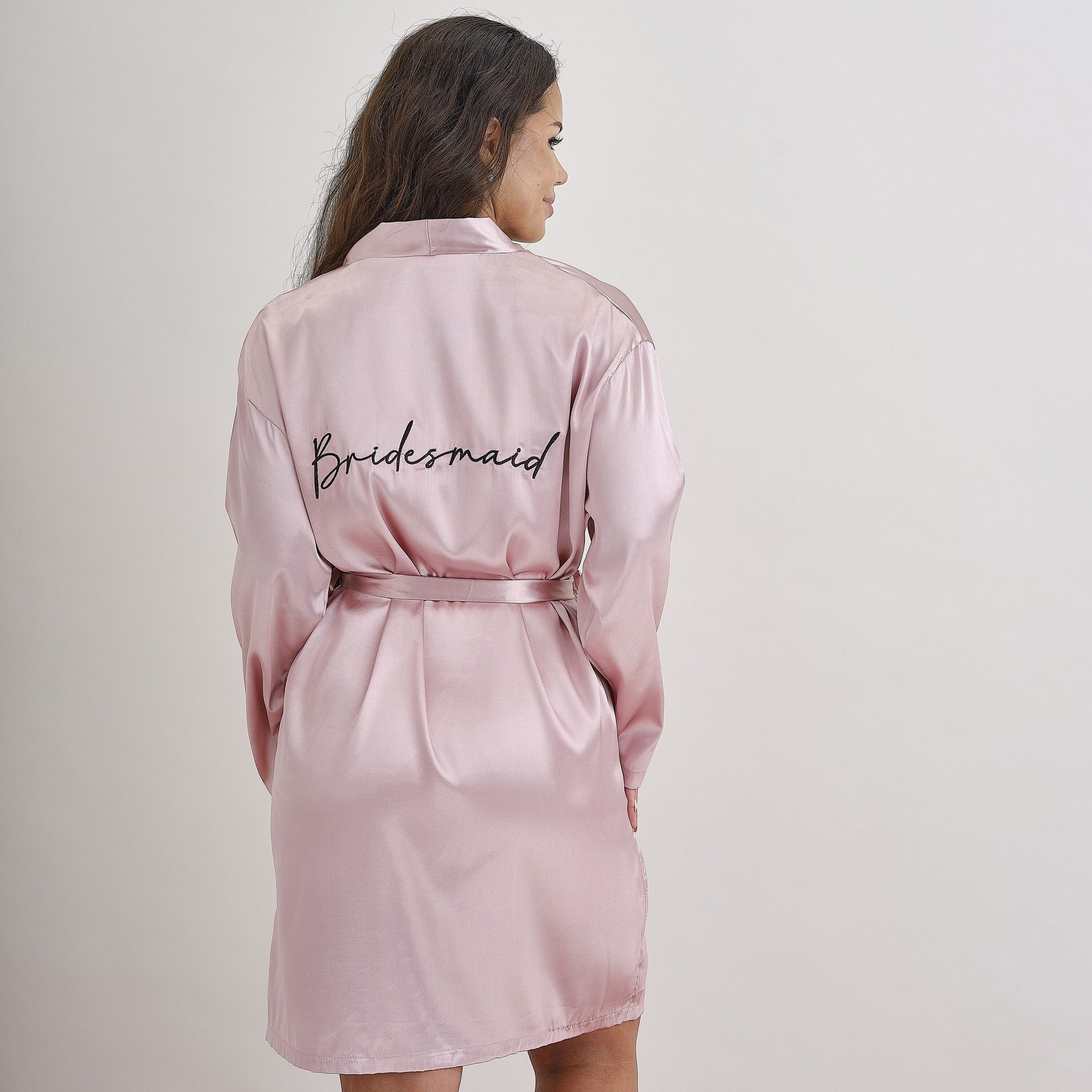 Saténový župan pro družičku s černým nápisem Bridesmaid. Župan je v růžové barvě s černým nápisem.