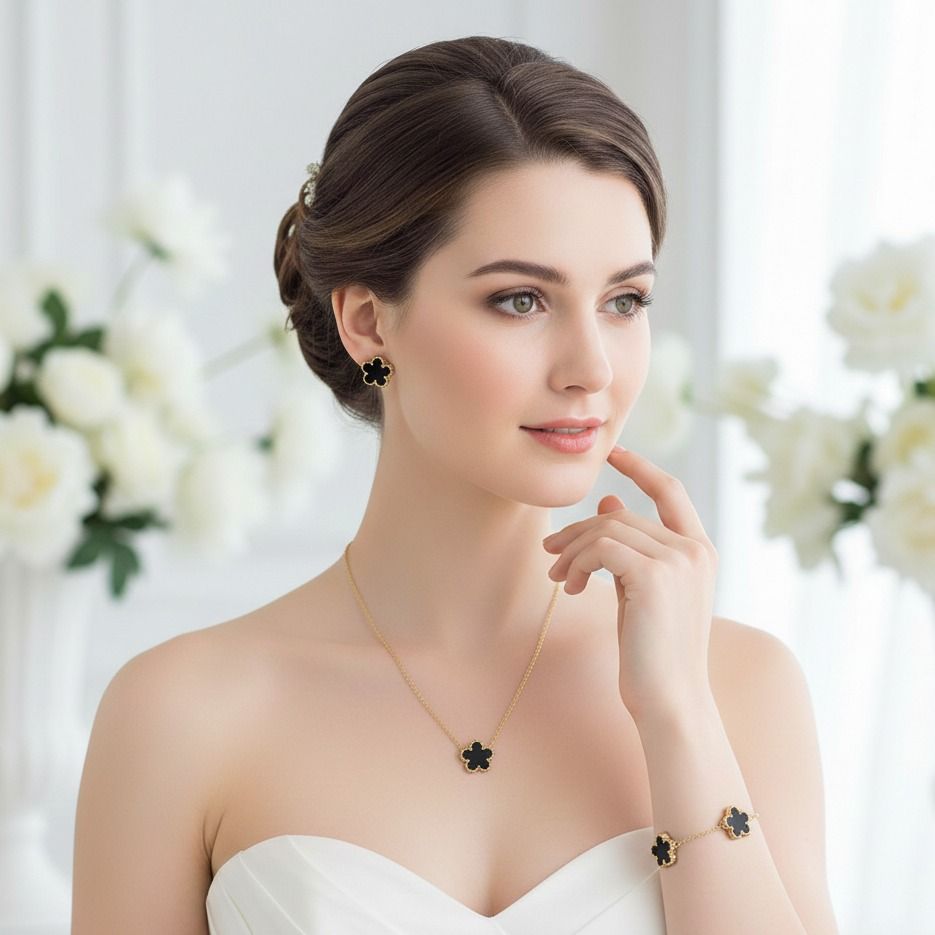 Náhrdelník, náramek a náušnice v trendy provedení. Barva květinek je černá.