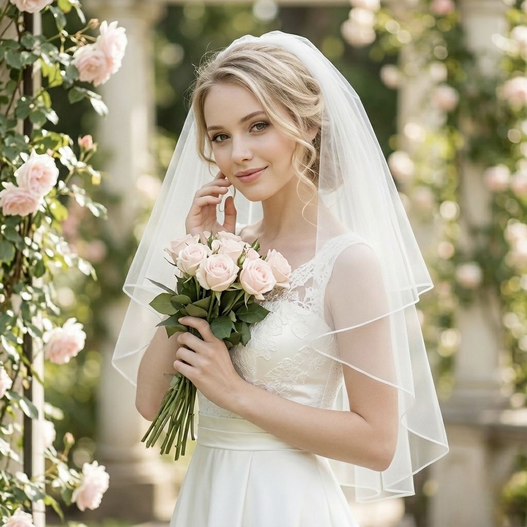 Jednoduchý krátký svatební závoj pro nevěstu. Závoj se skládá ze 2 vrstev. Upevnění pomocí hřebínku. Závoj je hladký.