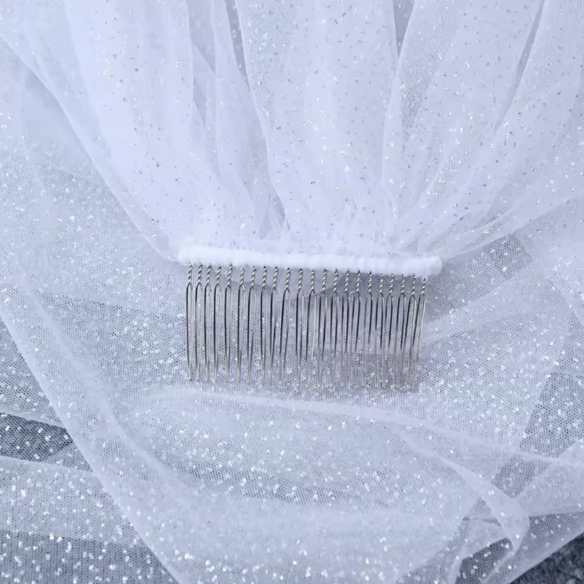 Krásný elegantní svatební závoj s jemnými třpytkami. Skládá se z 1 vrstvy. Závoj je ukončen hřebínkem.