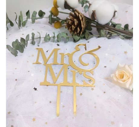 Zlatý akrylový zápich na svatební dort Mr. & Mrs.