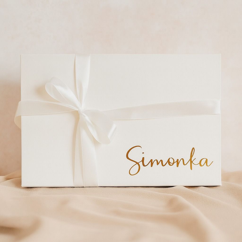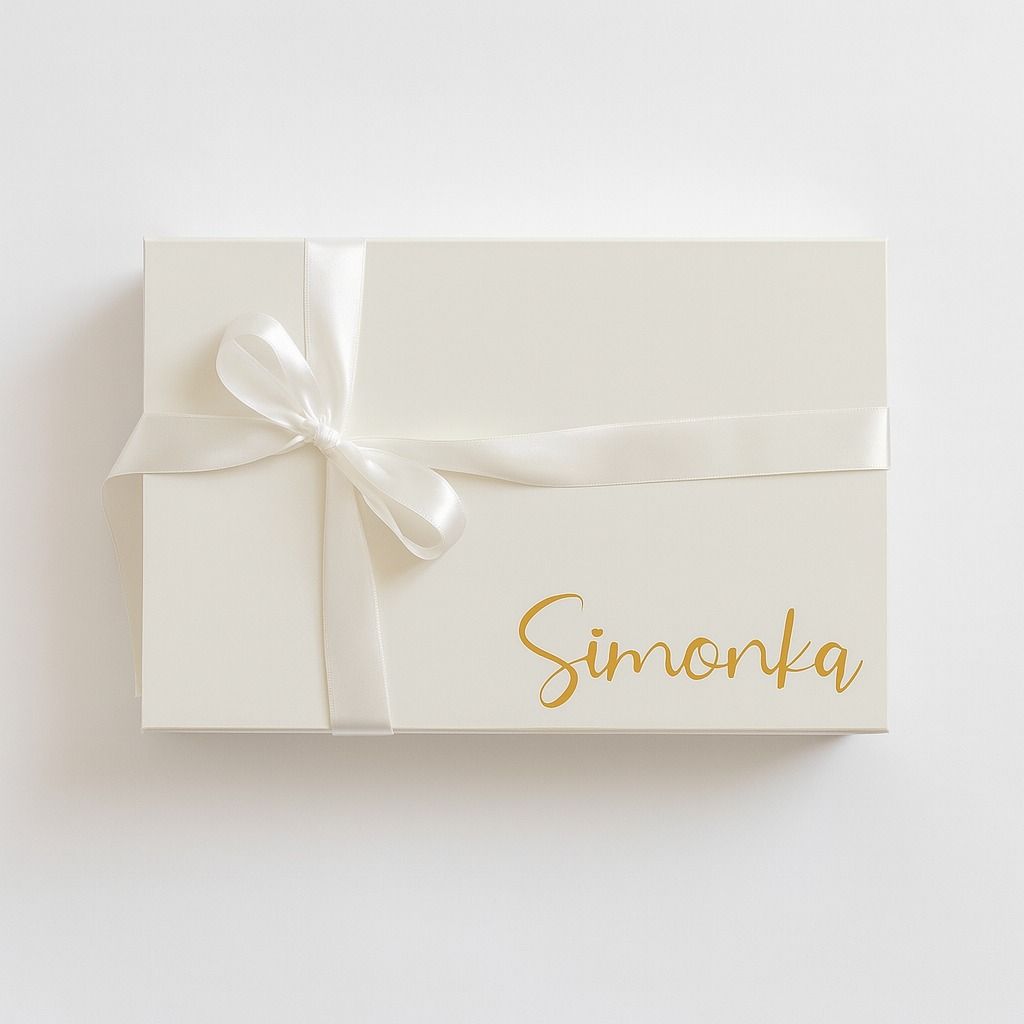Krabičku lze ozdobit jménem ve zlaté, stříbrné nebo růžově zlaté barvě. Text lze umístit do středu nebo do spodní části krabičky.