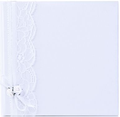 Elegantní svatební pouzdro ve tvaru čtverce ve vzhledu obalu knihy je v bílé barvě je doplněno na levé straně krajkou, 3mm bílou saténovou stuhou svázanou na mašličku, dvěma přírodními bílými papírovými květinami. Na vnitřních stranách se nacházejí bílé obálky na CD / DVD. Vnitřek i zadní obal je bílý.