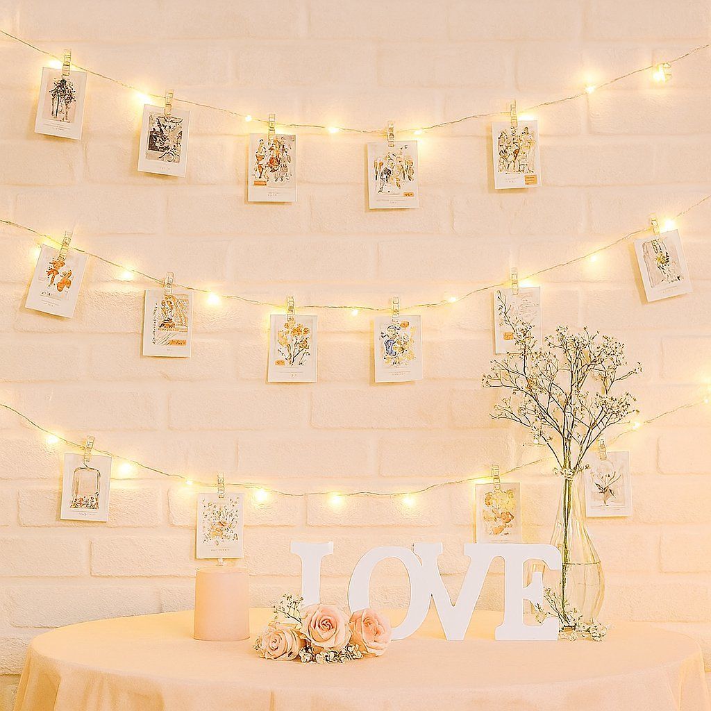Světelný řetěz na fotky pěkně ozvláštní svatební výzdobu.