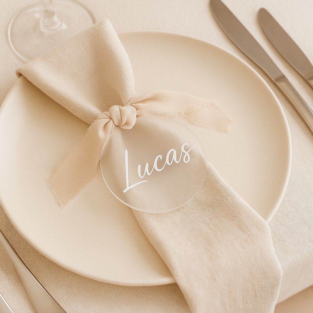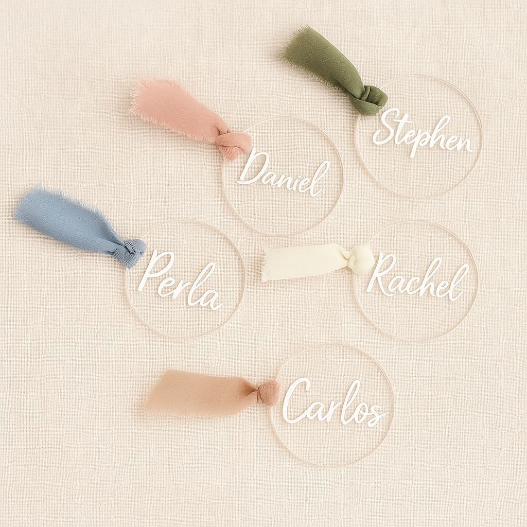 Akrylové jmenovky na svatbu se jmény. Jména jsou na transparentním akrylovém podkladu vyrovnána z nalepovací fólie.