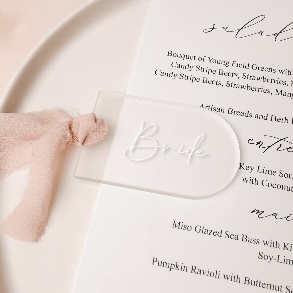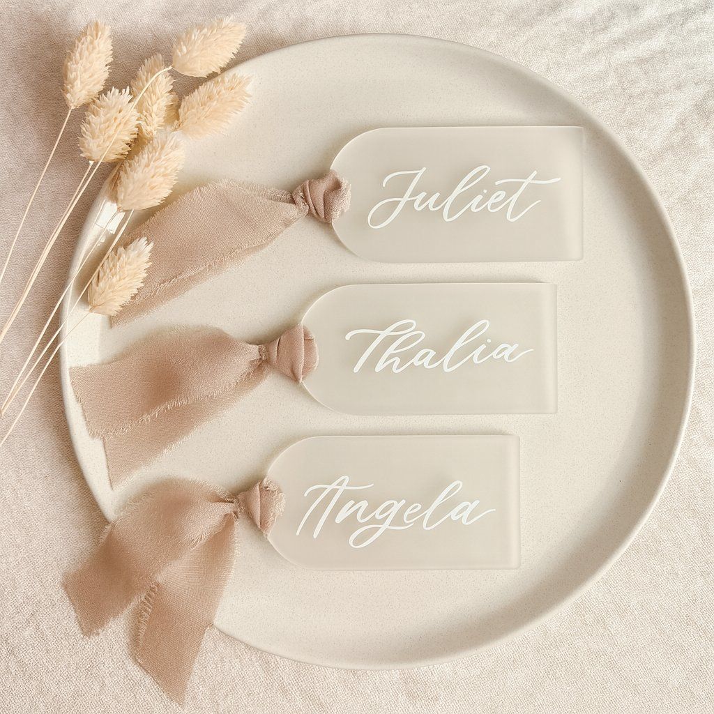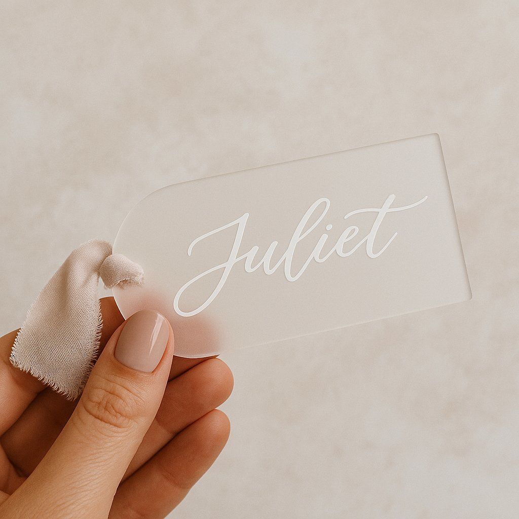 Akrylové jmenovky na svatbu se jmény. Jména jsou na akrylovém podkladu vyrovnána z nalepovací fólie.