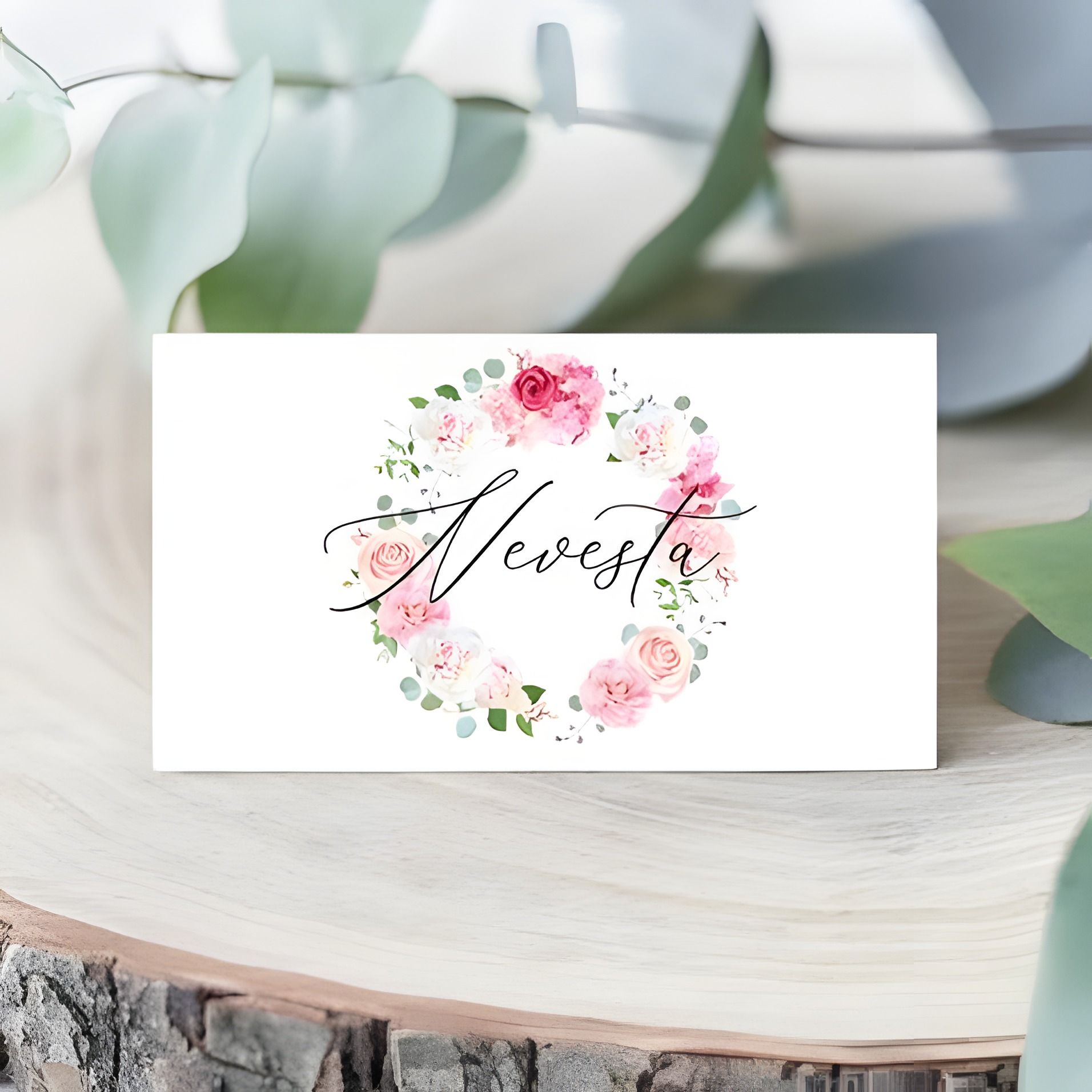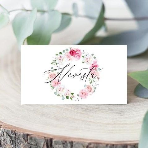 Materiál: tvrdý papír Velikost: 9x5 cm Cena za jeden kus. Jména na jmenovky posílejte na mail info@svatbickovo.cz v souboru Excel.