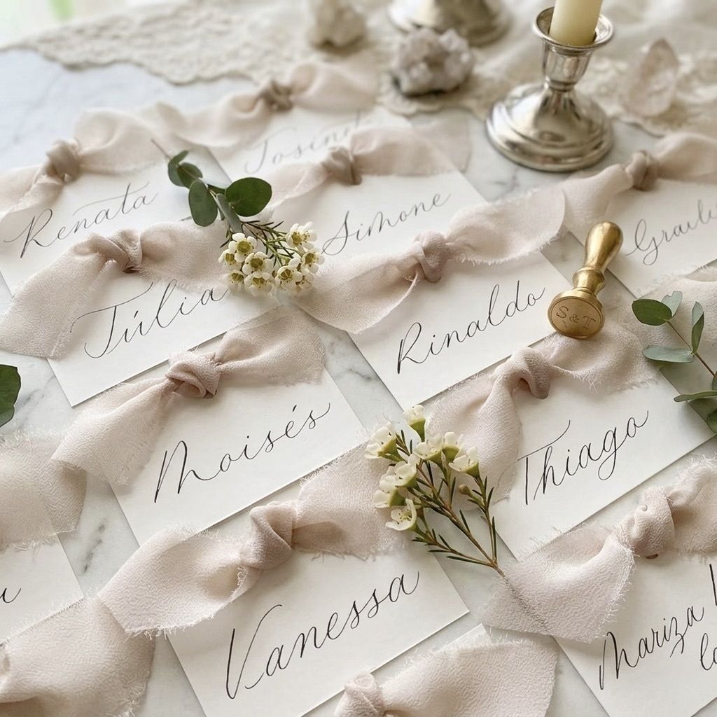 Hledáte spojení tradiční elegance a jemného detailu? Naše svatební jmenovky zdobené stuhou jsou tou správnou volbou pro nevěsty, které milují romantiku a hřejivé materiály. Každá kartička se jménem hosta je doplněna o kvalitní šifonovou stuhu, která dodává prostírání barvu a šmrnc. Tyto ozdobné svatební jmenovky se skvěle hodí ke svatebním menu kartám a vyniknou položené přímo na talíři nebo ubrousku. Vyberte si ze široké palety odstínů stuh a slaďte své jmenovky s květinovou výzdobou či šaty družiček, čímž vytvoříte harmonický a nezapomenutelný vizuál vaší svatební tabule.