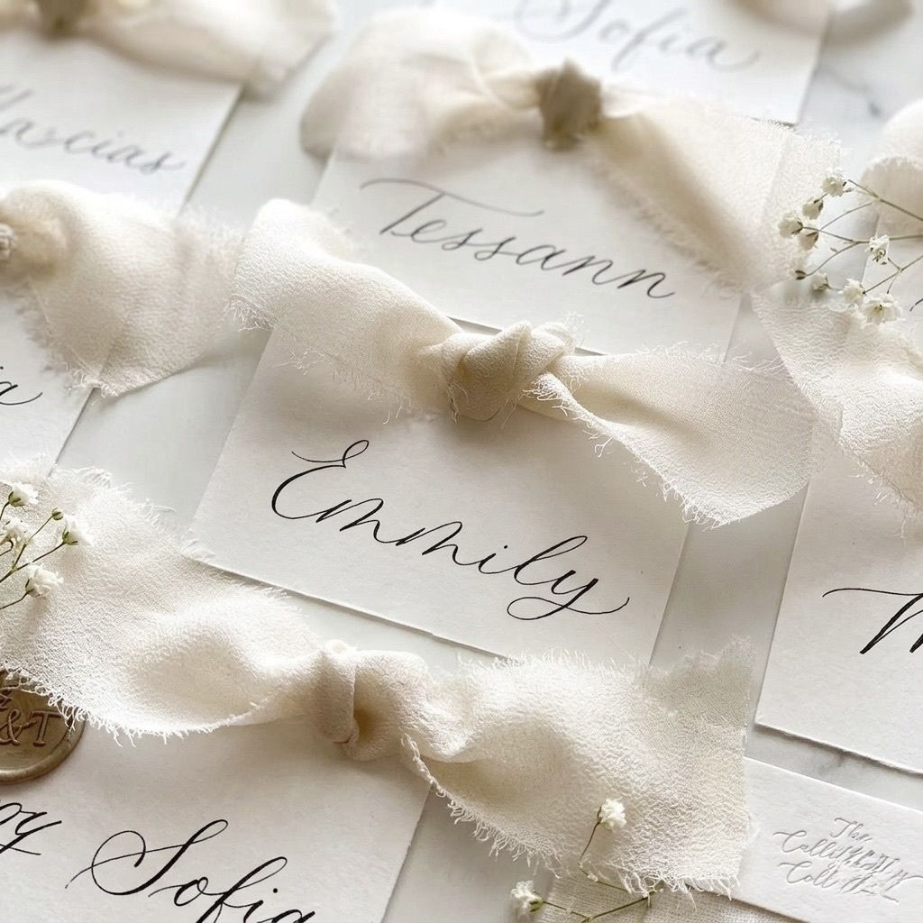 Překrásné jmenovky na stůl v klasickém tvaru kartičky. Přední část je zdobena stuhou, jejíž barvu je možné přizpůsobit barevnosti vaší svatby.