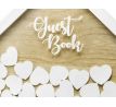 Netradiční dřevěná svatební kniha pro hosty ve tvaru domečku s 50 kusy bílých srdcí, na které se píší odkazy pro novomanžele. Rámeček je v bílé barvě a v přední části se nachází sklo, na kterém je nápis Guest Book.