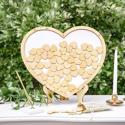 Netradiční dřevěná svatební kniha pro hosty ve tvaru srdce s 70 kusy přírodních dřevěných srdcí, na které se píší odkazy pro novomanžele. Rámeček je v přírodní barvě a v přední části se nachází sklo. Součástí balení je i stojan.