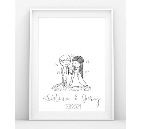 Obraz je personalizovaný - s Vašimi jmény, p.p. datem Vaší svatby. Obraz je tištěný jako plakát v rozměrech šířka 30cm a výška 40cm na kvalitní matný papír v kvalitě 200g.