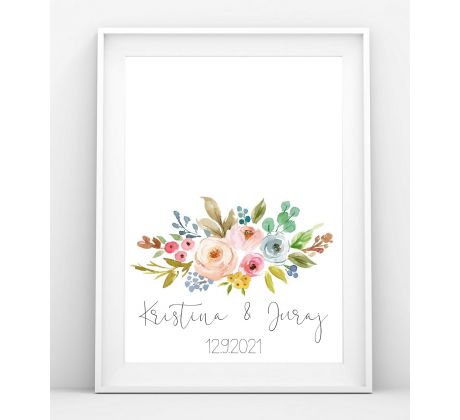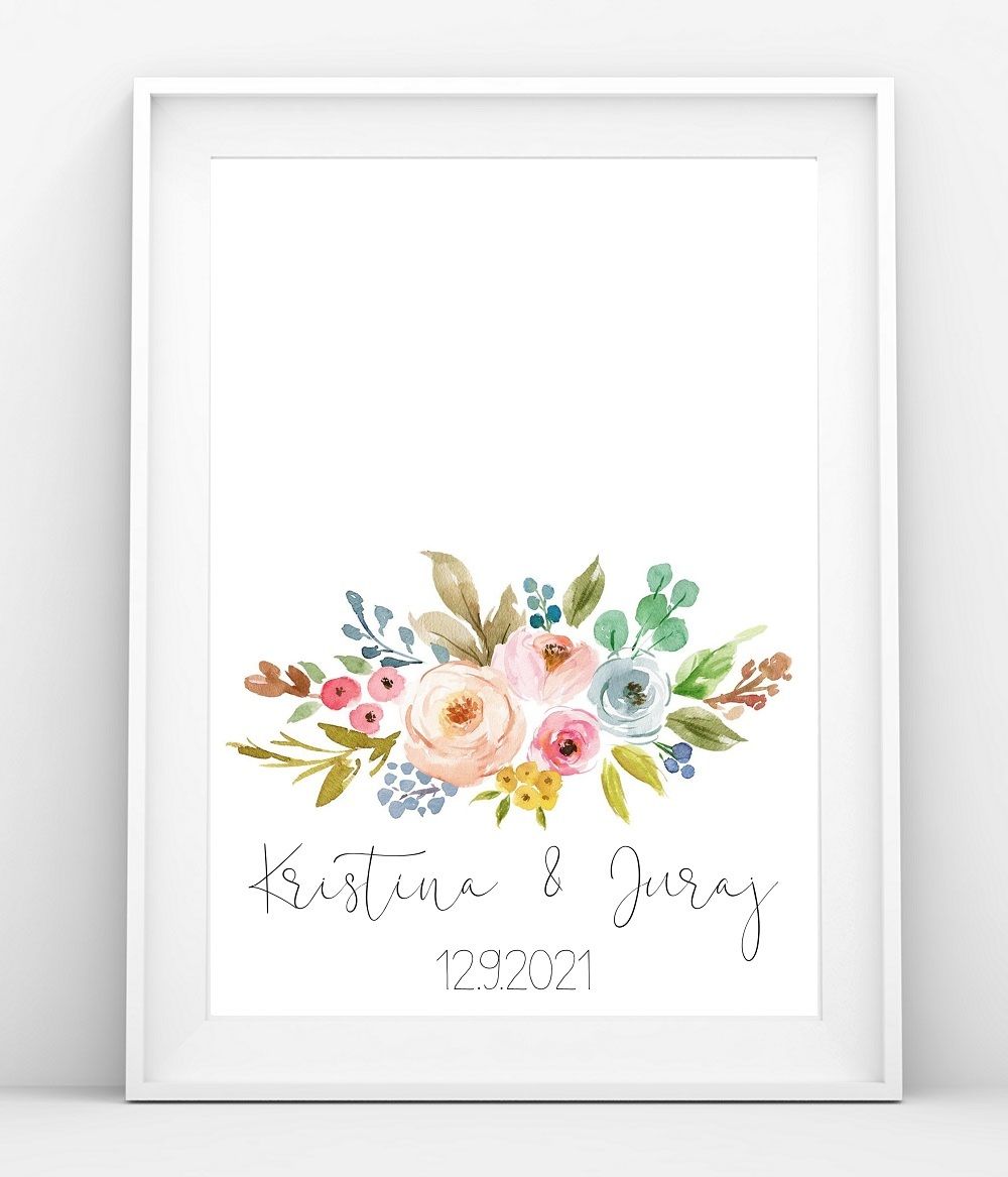 Obraz je personalizovaný - s Vašimi jmény, p.p. datem Vaší svatby. Obraz je tištěný jako plakát v rozměrech šířka 30cm a výška 40cm na kvalitní matný papír v kvalitě 200g.