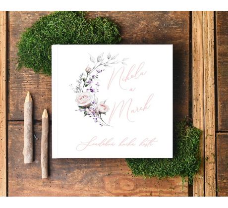 Jemná svatební kniha hostů s pevným obalem a vlastním textem. Na knihu hostů lze napsat libovolný text, například jména, datum svatby, slova svatební kniha a jiné.