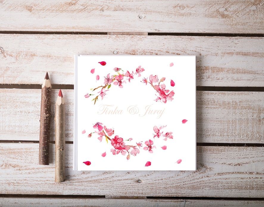Jemná svatební kniha hostů s pevným obalem a vlastním textem. Na knihu hostů lze napsat libovolný text, například jména, datum svatby, slova svatební kniha a jiné.