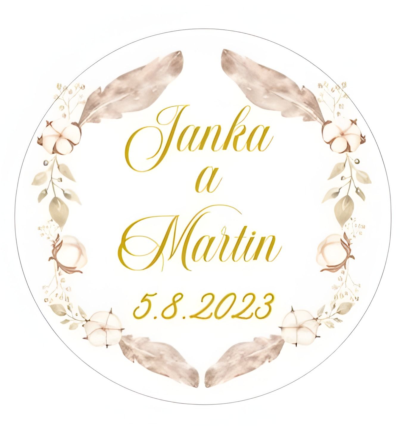 Svatební nálepky s vlastním textem, například se jmény ženicha a nevěsty, datem svatby, či iniciálami.