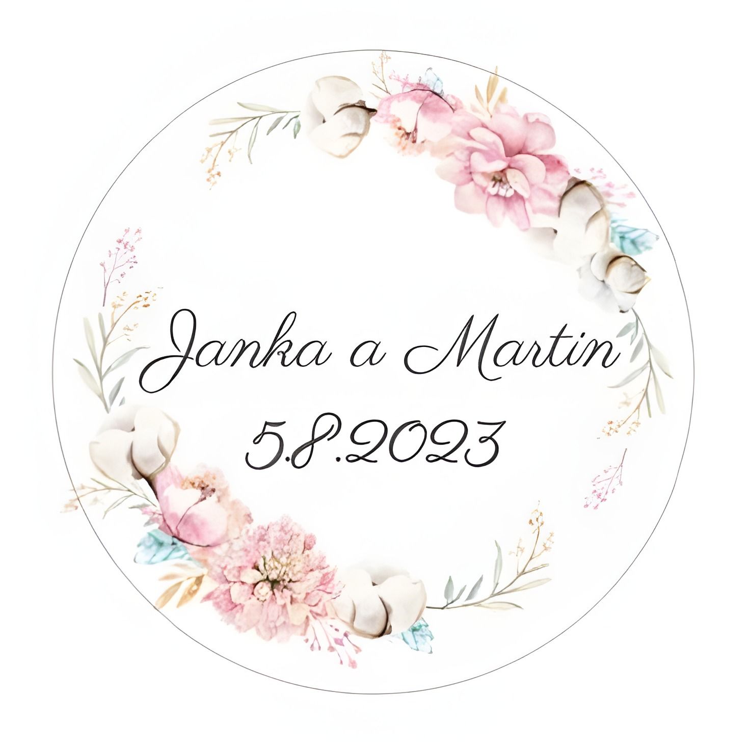 Svatební nálepky s vlastním textem, například se jmény ženicha a nevěsty, datem svatby, či iniciálami.