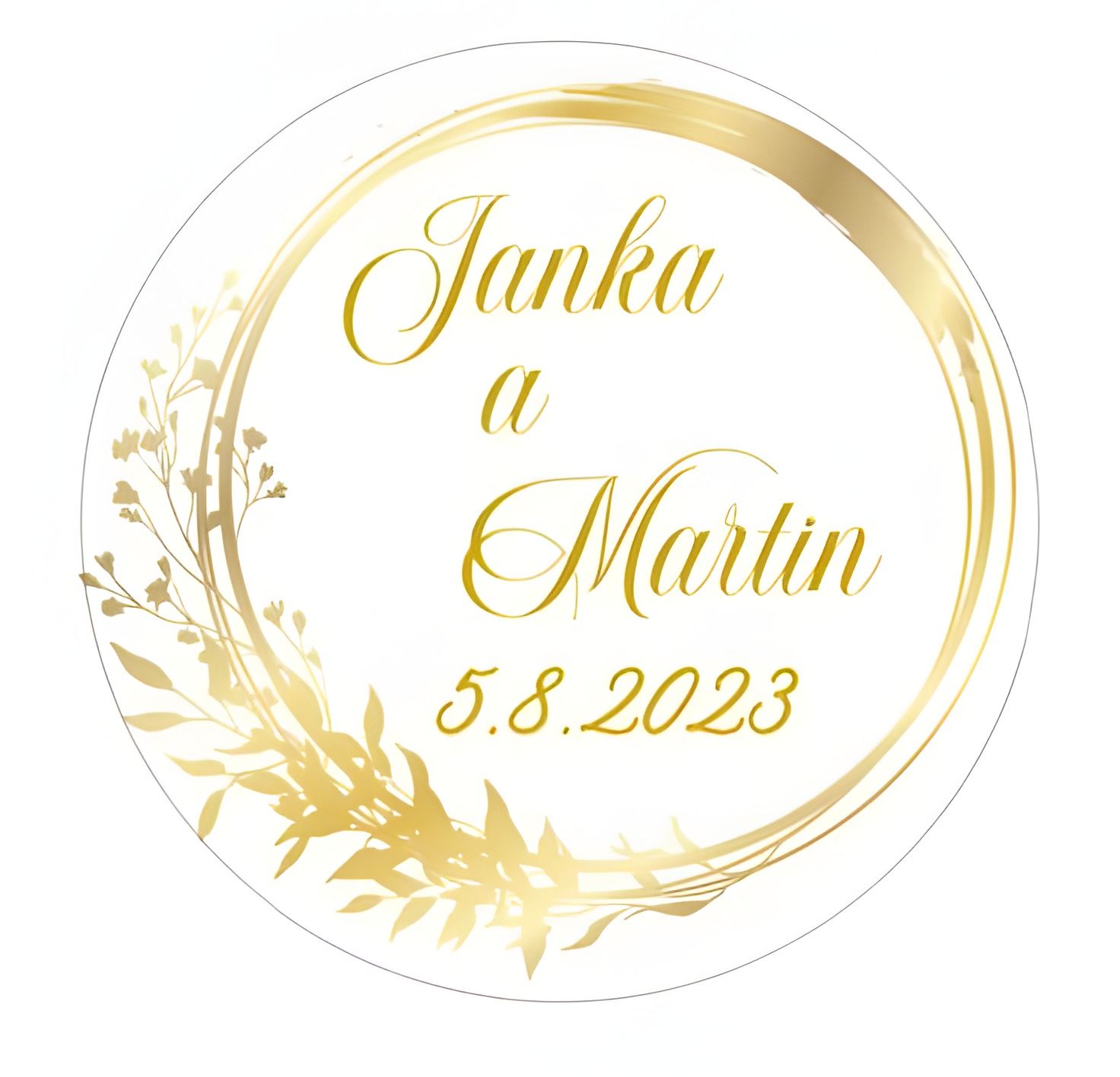 Svatební nálepky s vlastním textem, například se jmény ženicha a nevěsty, datem svatby, či iniciálami.