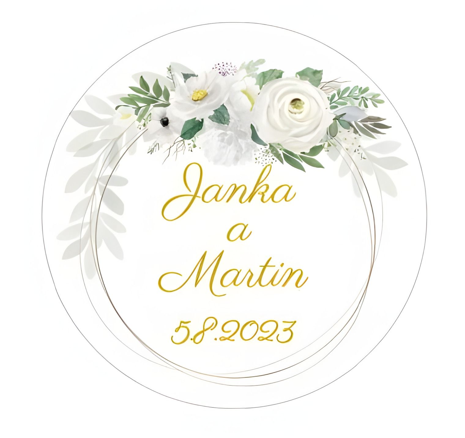 Svatební nálepky s vlastním textem, například se jmény ženicha a nevěsty, datem svatby, či iniciálami.