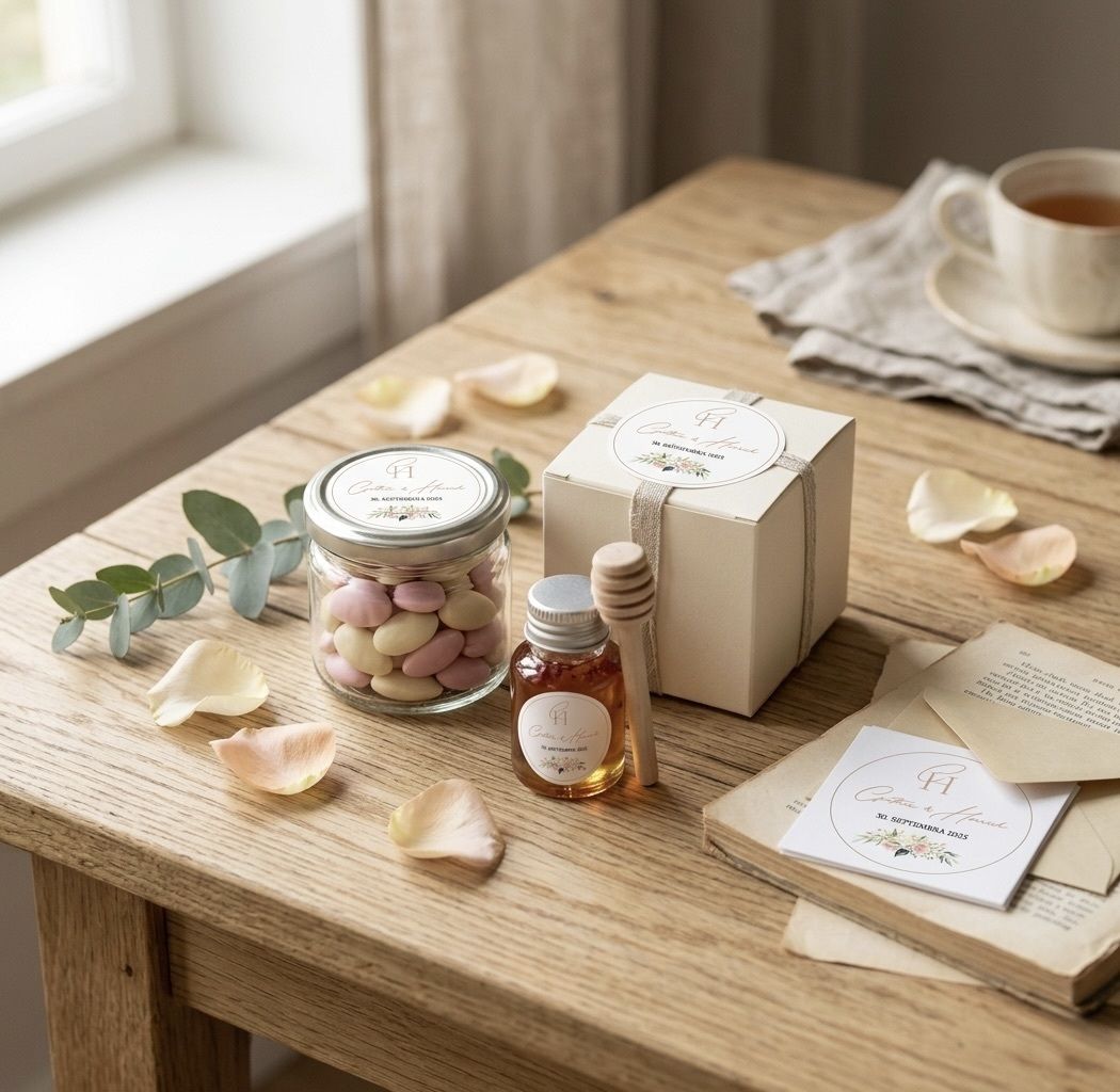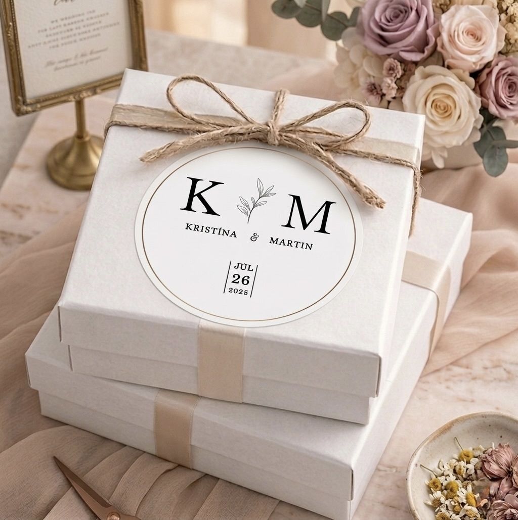 Svatební nálepky s vlastním textem, například se jmény ženicha a nevěsty, datem svatby, či iniciálami.
