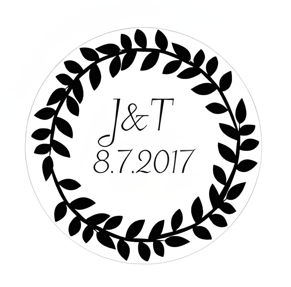 Svatební nálepky s vlastním textem, například s jmény ženicha a nevěsty, datem svatby, či iniciálami.