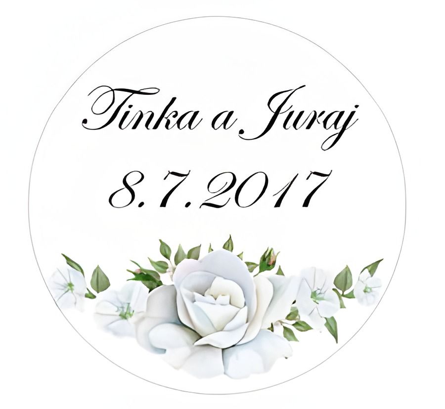 Svatební nálepky s vlastním textem, například s jmény ženicha a nevěsty, datem svatby, či iniciálami.
