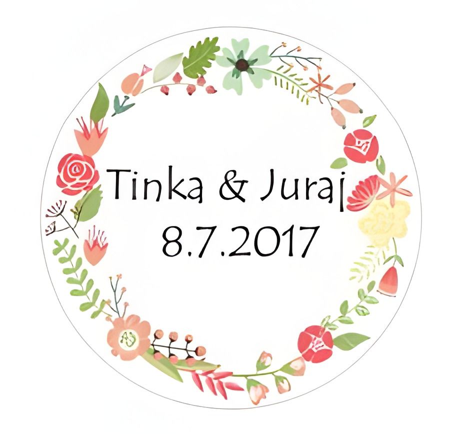 Svatební nálepky s vlastním textem, například s jmény ženicha a nevěsty, datem svatby, či iniciálami.