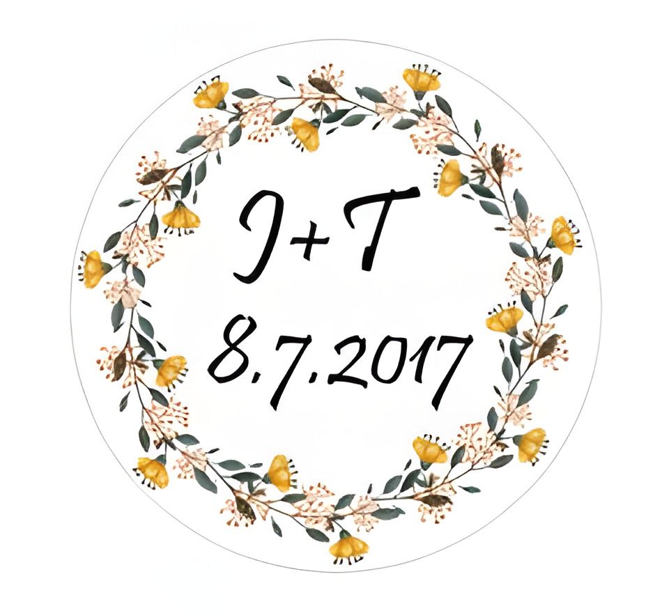Svatební nálepky s vlastním textem, například s jmény ženicha a nevěsty, datem svatby, či iniciálami.