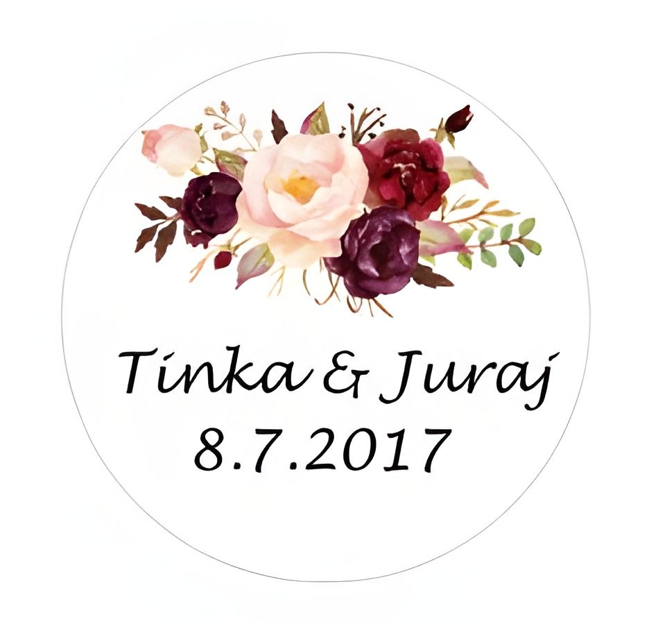 Svatební nálepky s vlastním textem, například s jmény ženicha a nevěsty, datem svatby, či iniciálami.