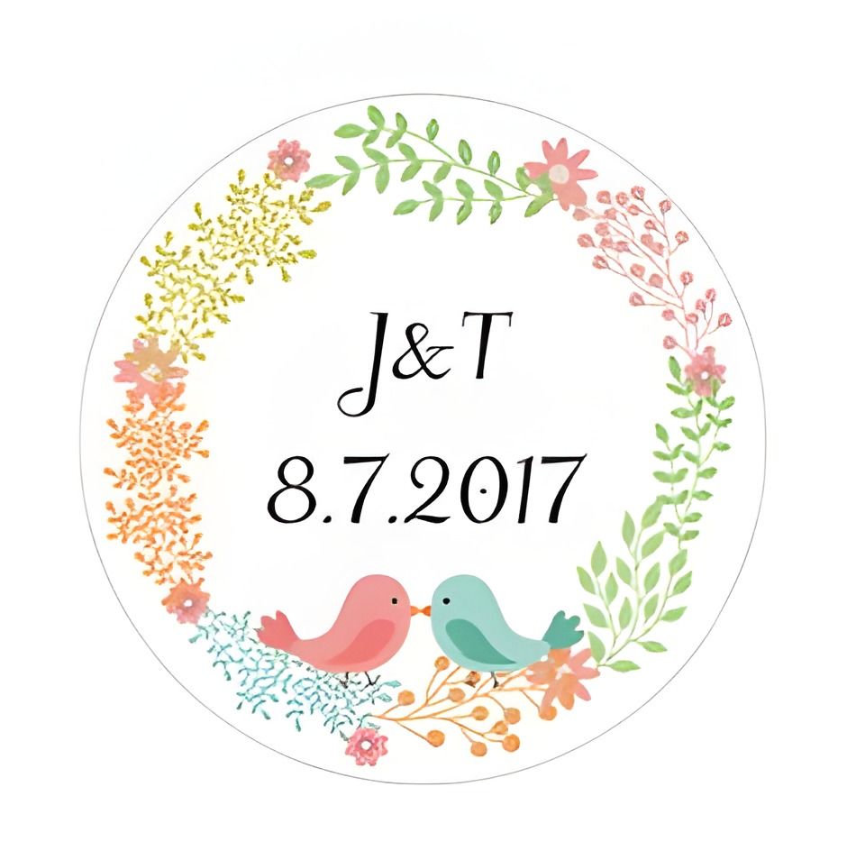 Svatební nálepky s vlastním textem, například s jmény ženicha a nevěsty, datem svatby, či iniciálami.