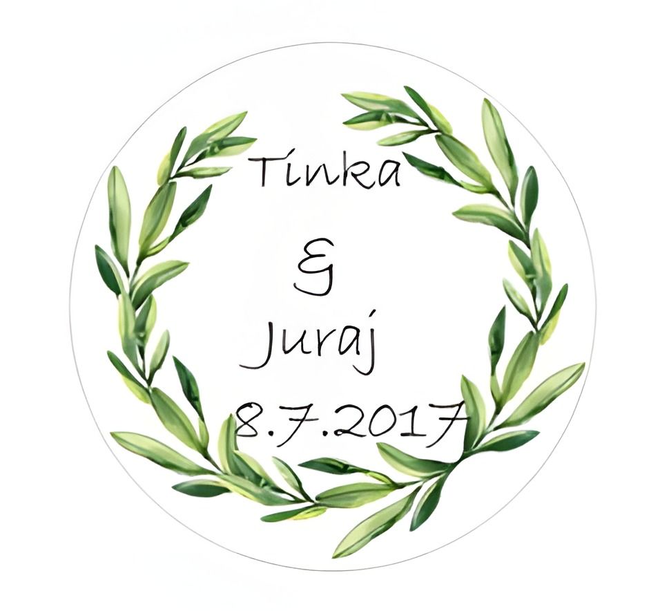Svatební nálepky s vlastním textem, například s jmény ženicha a nevěsty, datem svatby, či iniciálami.