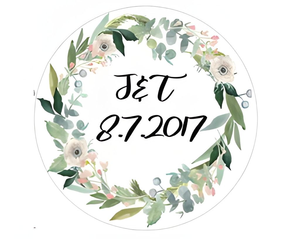 Svatební nálepky s vlastním textem, například s jmény ženicha a nevěsty, datem svatby, či iniciálami.