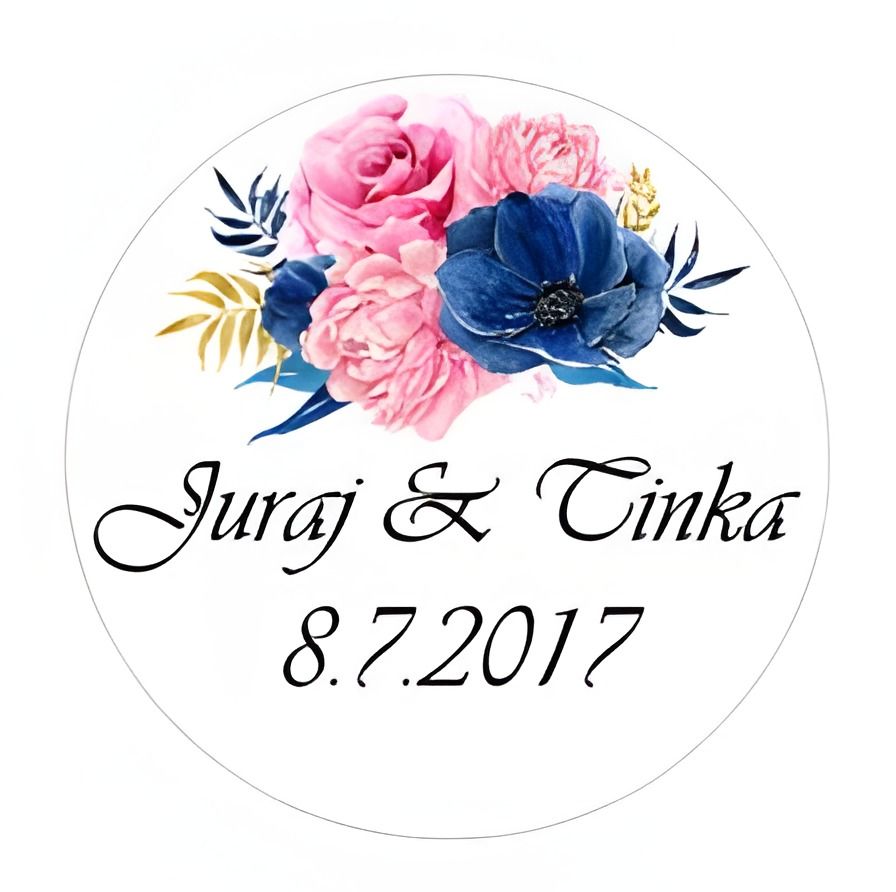 Svatební nálepky s vlastním textem, například s jmény ženicha a nevěsty, datem svatby, či iniciálami.
