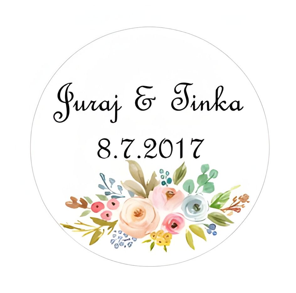 Svatební nálepky s vlastním textem, například s jmény ženicha a nevěsty, datem svatby, či iniciálami.