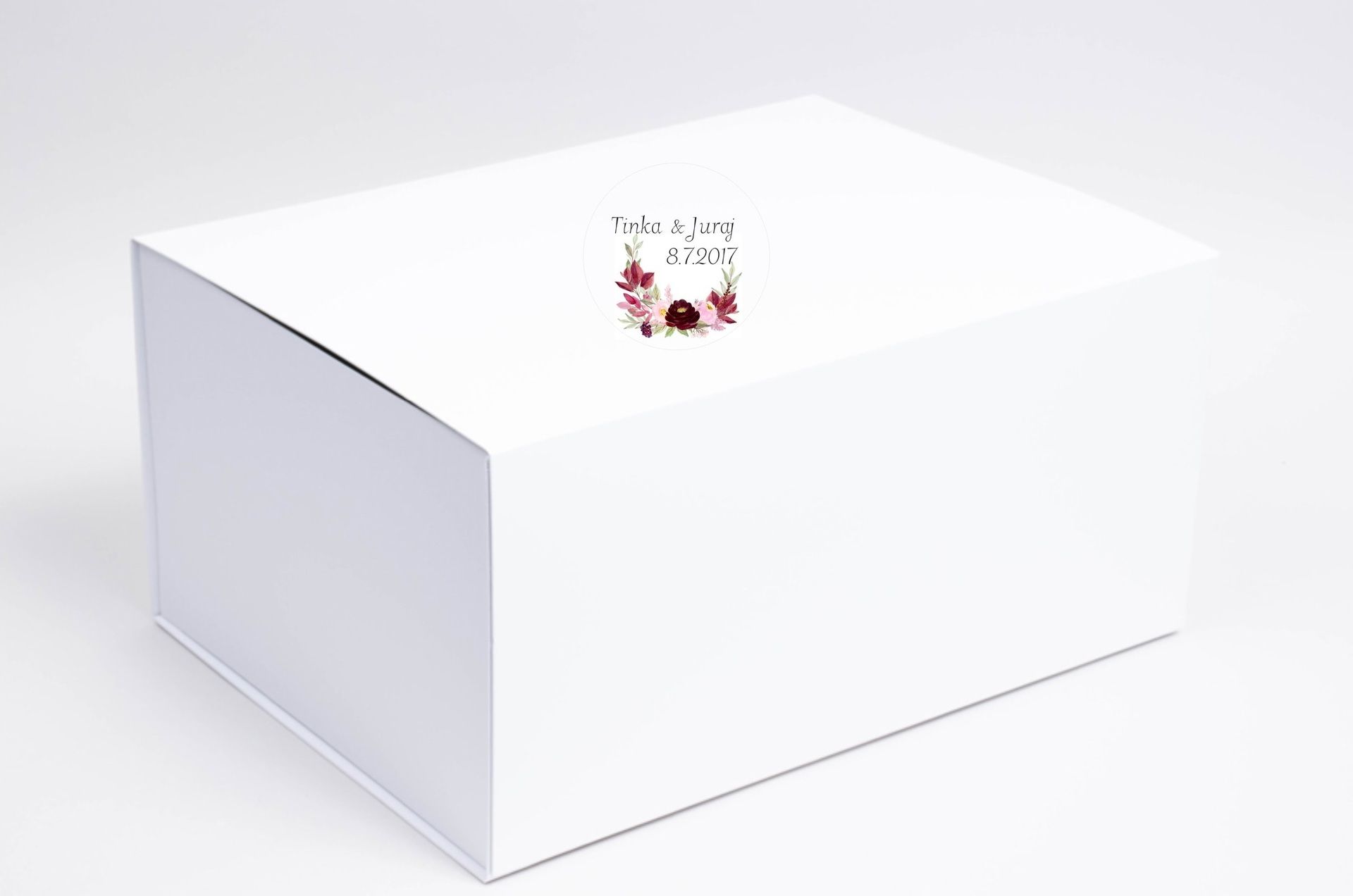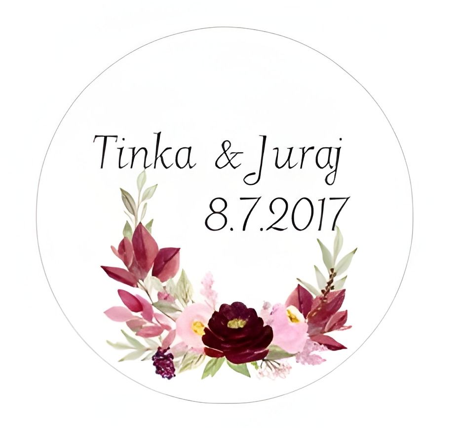 Svatební nálepky s vlastním textem, například s jmény ženicha a nevěsty, datem svatby, či iniciálami.