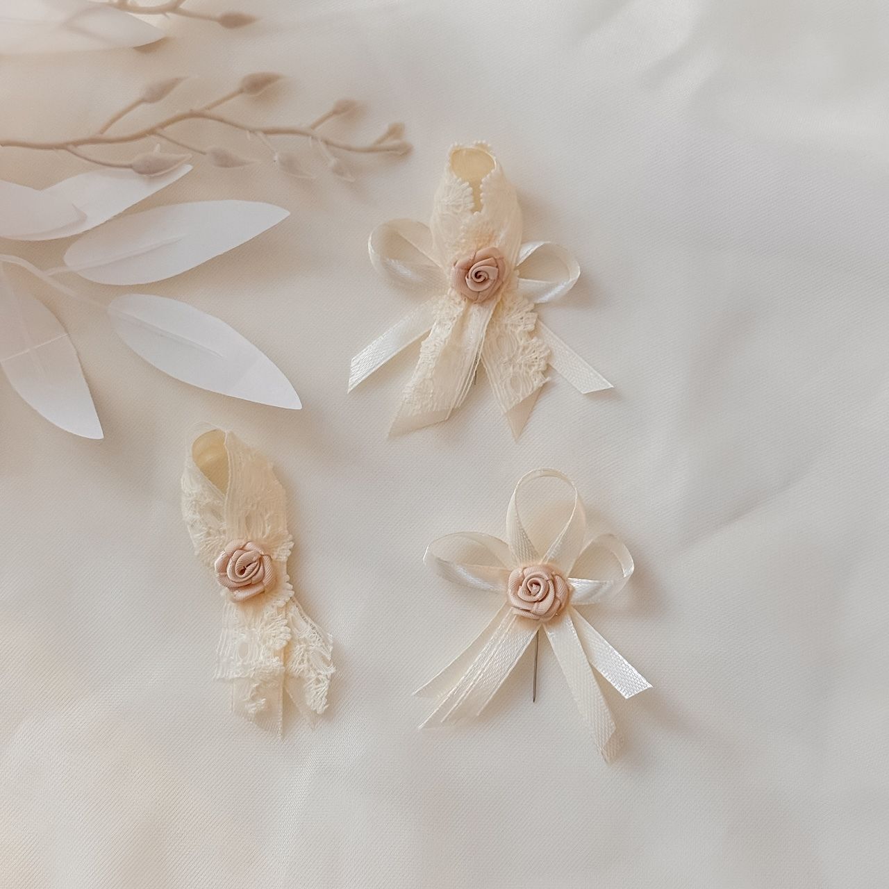 Elegantní svatební vývazky, které jsou symbolem úcty a důležitosti vašich nejbližších hostů. Tyto vkusné drobné vývazky jsou vyrobeny z kvalitních saténových stuh a doplňků, aby po celý den zdobily klopy vašich svatebčanů a dodaly jim pocit sounáležitosti. Díky široké škále barev je hravě sladíte se svou svatební výzdobou.