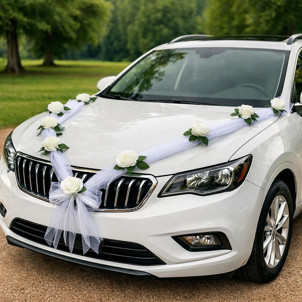 Dekorace na svatební auto s umělými květinami